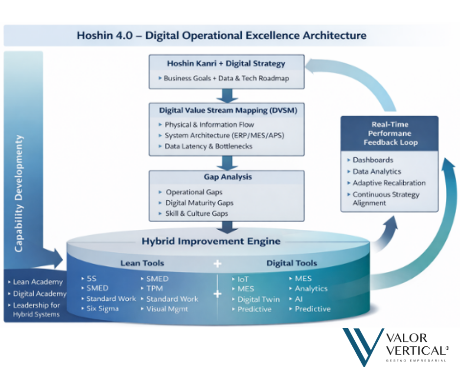 A figura apresentada ilustra esse conceito por meio do que chamamos de Hoshin 4.0 – Digital Operational Excellence Architecture. Nessa lógica, a estratégia digital não é algo separado da estratégia do negócio. Pelo contrário, ela nasce da definição clara de objetivos empresariais e do entendimento de como dados, tecnologia e arquitetura digital podem apoiar o crescimento, a competitividade e a eficiência operacional.